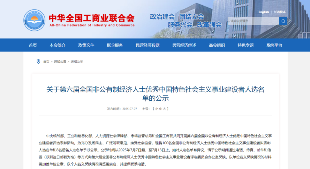 7月7日,《关于第六届全国非公有制经济人士优秀中国特色社会主义事业建设者人选名单的公示》对外发布。公示时间从2025年7月7日起,至7月13日止。我校校友彭志辉在《第六届全国非公有制经济人士优秀中国特色社会主义事业建设者拟表彰人选公示名单(100人)》内、校友刘斌在《后备人选公示名单(8人)》内。