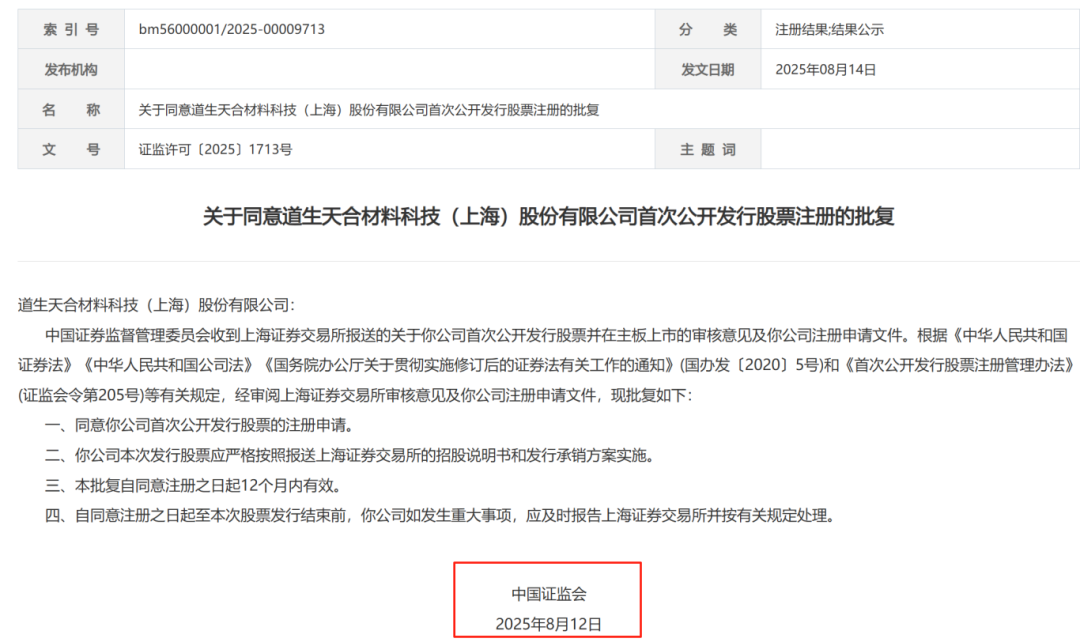 8月14日,中国证监会下发关于同意道生天合材料科技(上海)股份有限公司首次公开发行股票注册的批复,同意该公司首次公开发行股票并在上交所主板上市的注册申请。