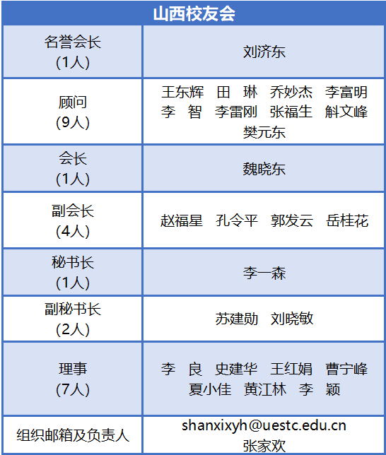 电子科技大学山西校友会旨在联络和服务在山西的电子科大校友,搭建交流与合作平台,促进校友间的信息共享、资源共享和共同发展。校友会通过定期组织校友聚会、讲座、行业交流等活动,加强校友与母校之间的联系,同时为校友提供职业发展支持与合作机会,并利用微信群、QQ群等渠道保持日常沟通与定期换届选举,确保组织有序运行。山西校友会始终致力于为山西地区的电子科大校友营造温馨、互助的社群环境,共同传承母校精神,积极服务地方经济社会发展。
