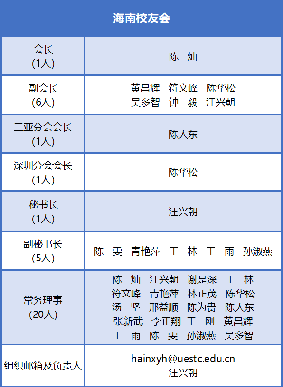 电子科技大学海南校友会于2013年在海口正式成立,是由早期在琼校友发起筹备的地区性校友组织。校友会以“情系母校、友谊长存、团结互助、携手共进”为宗旨,建立了由各年级代表组成的理事会、常务理事会及秘书处等组织架构,致力于搭建海南校友与母校及全球校友间的交流互助平台。在活动开展方面,校友会积极组织参与高校海南校友会羽毛球联赛、足球联赛等体育赛事并屡获佳绩,开展爱心捐款等公益活动,举办迎新会、读书会、户外旅行等文化交流活动,并组团参与母校校庆,全方位增强校友凝聚力。凭借卓越的表现,海南校友会于2016年被评为电子科技大学“优秀校友会”,并多次荣获海南省文体部门颁发的“文化体育事业发展特殊贡献奖”,现已成为海南地区成电校友传承母校文化、推动事业共同发展的精神家园和重要合作平台。